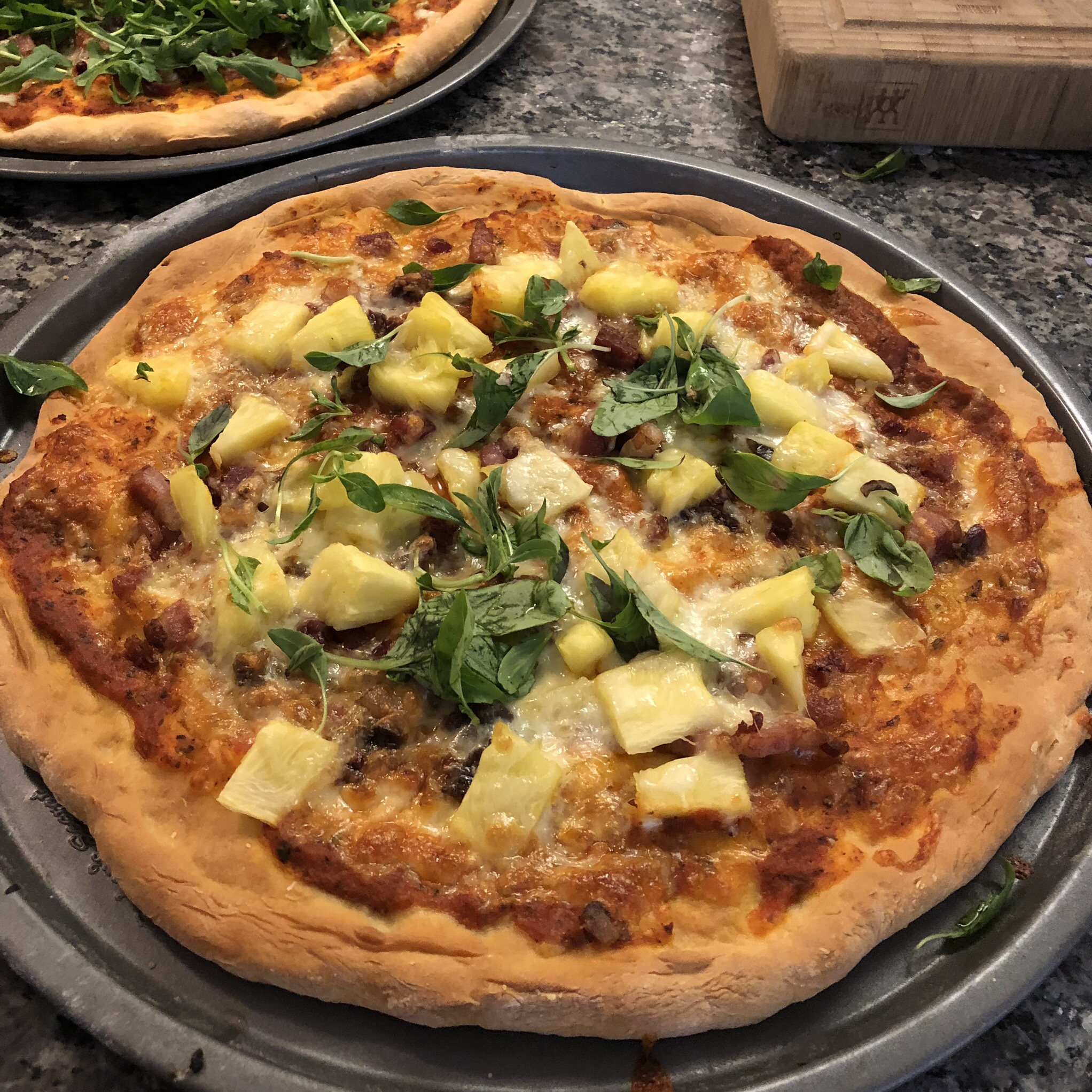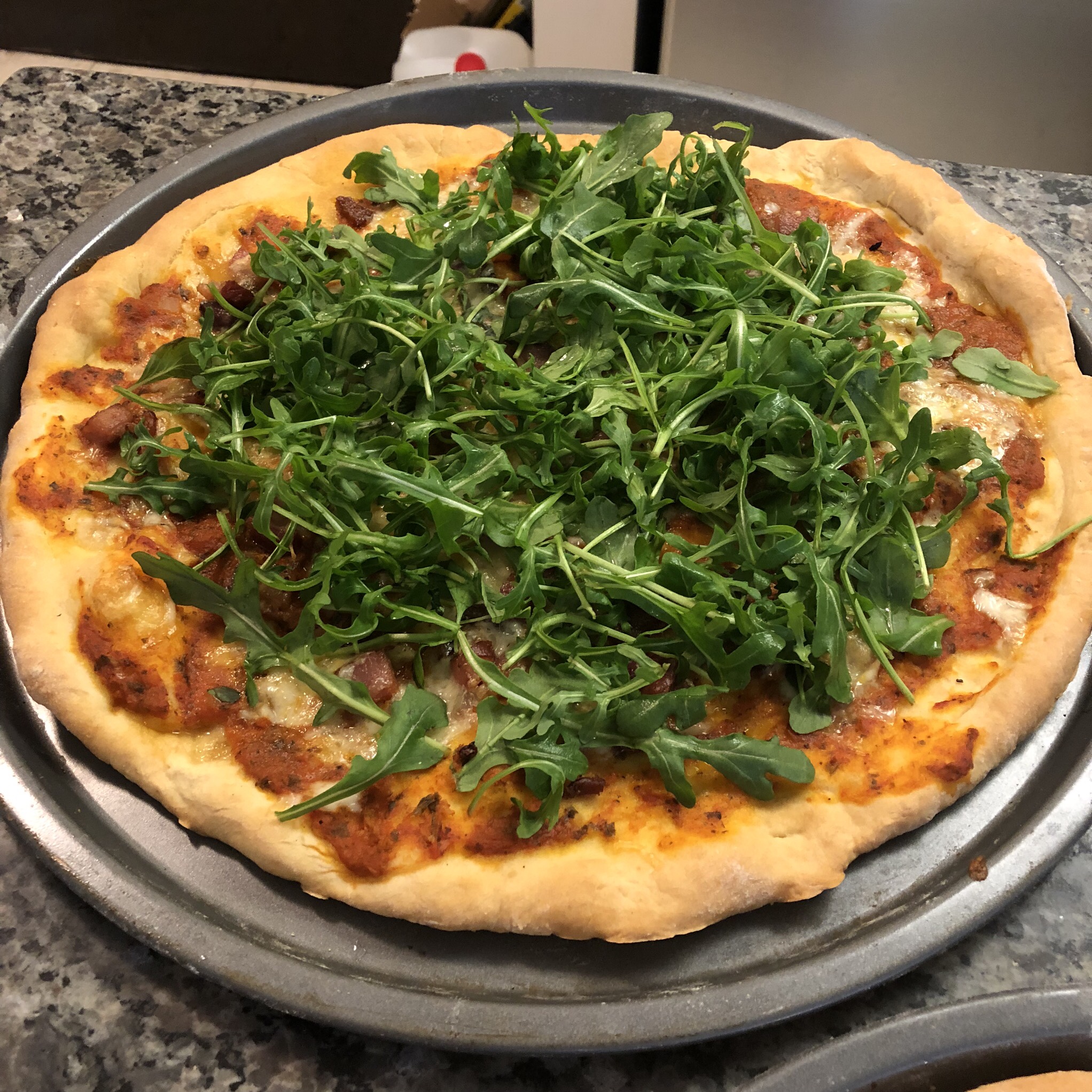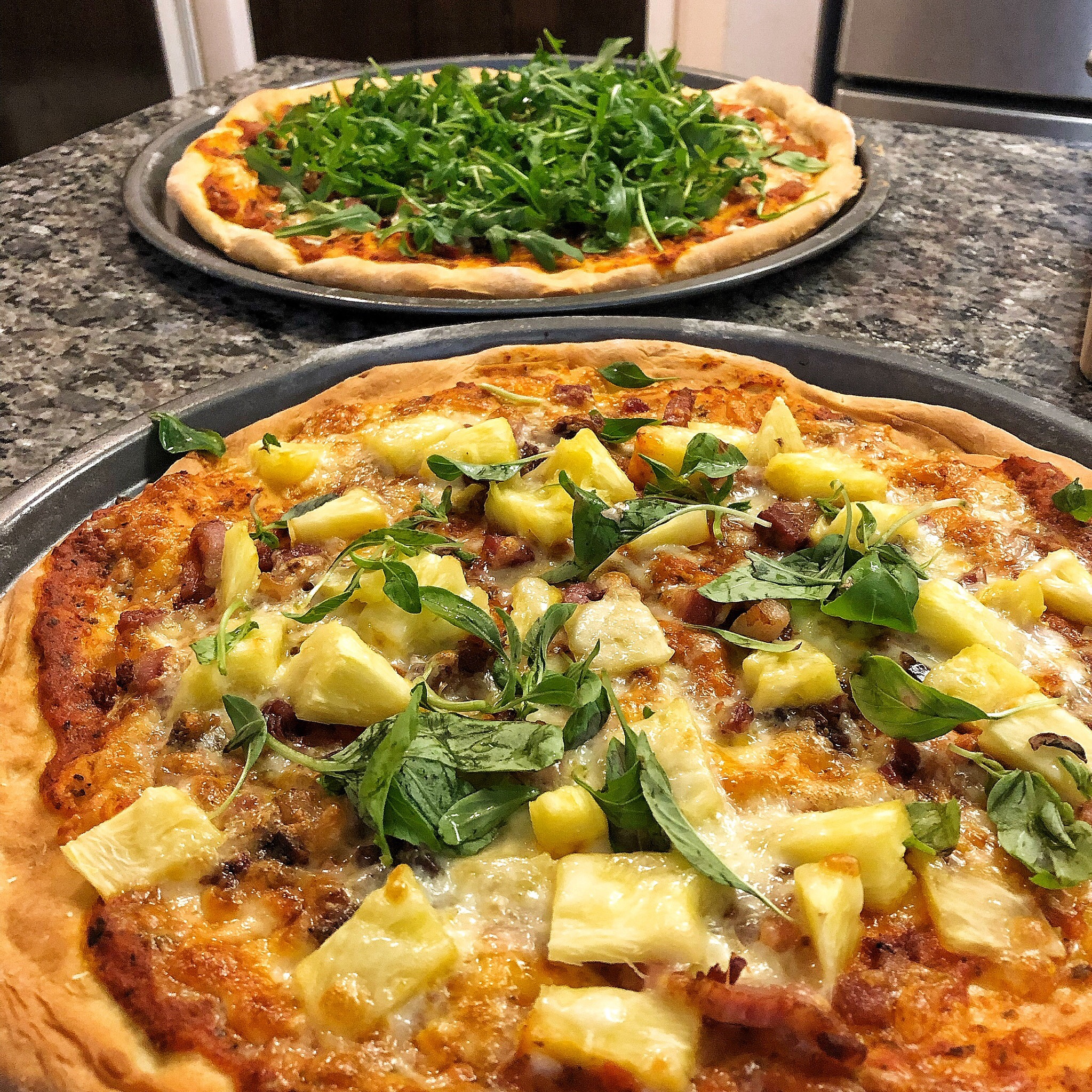 I made a no yeast pizza dough for these pizzas. All high quality organic ingredients, including our own home grown basil thanks the AeroGarden in our kitchen.