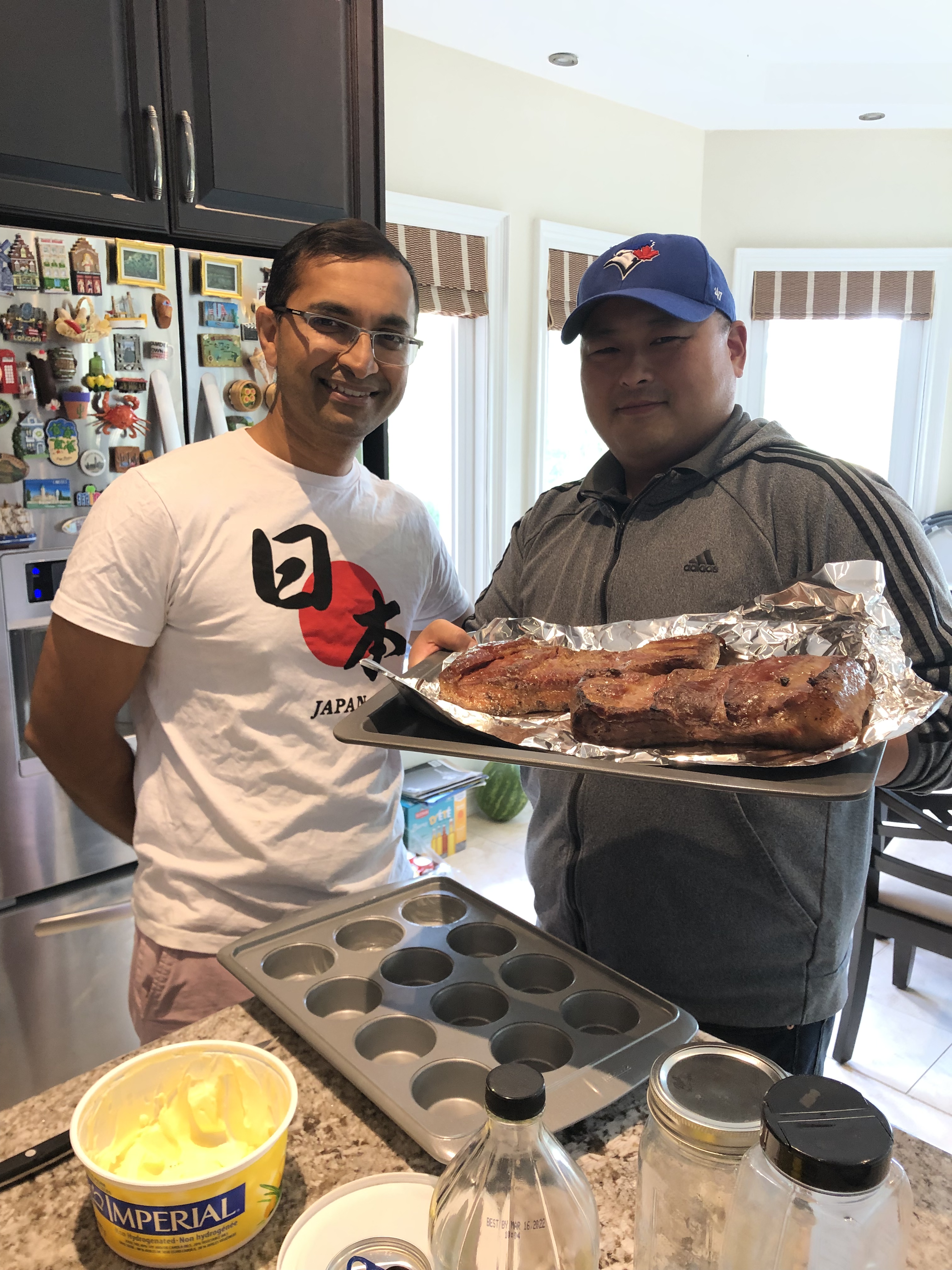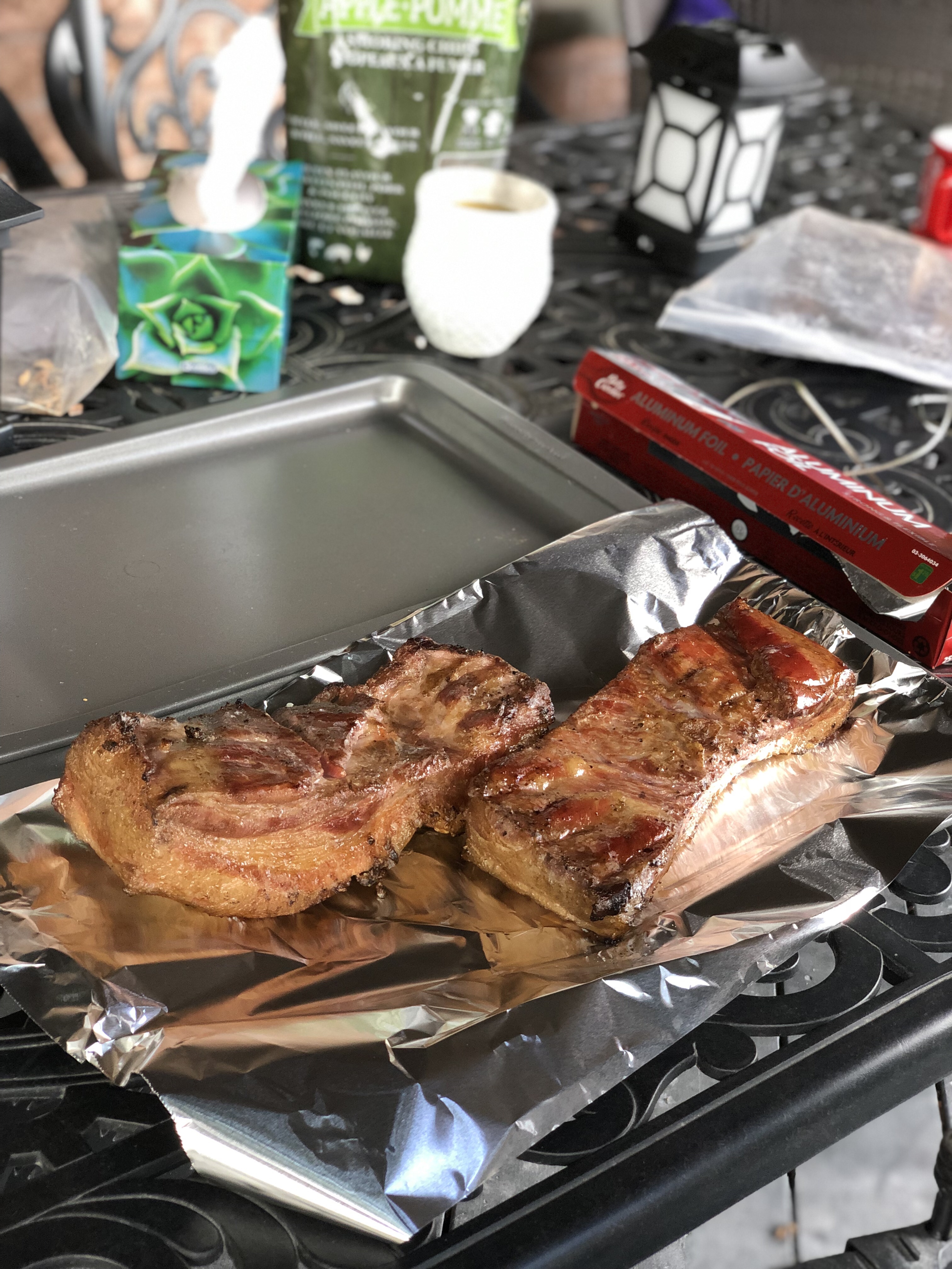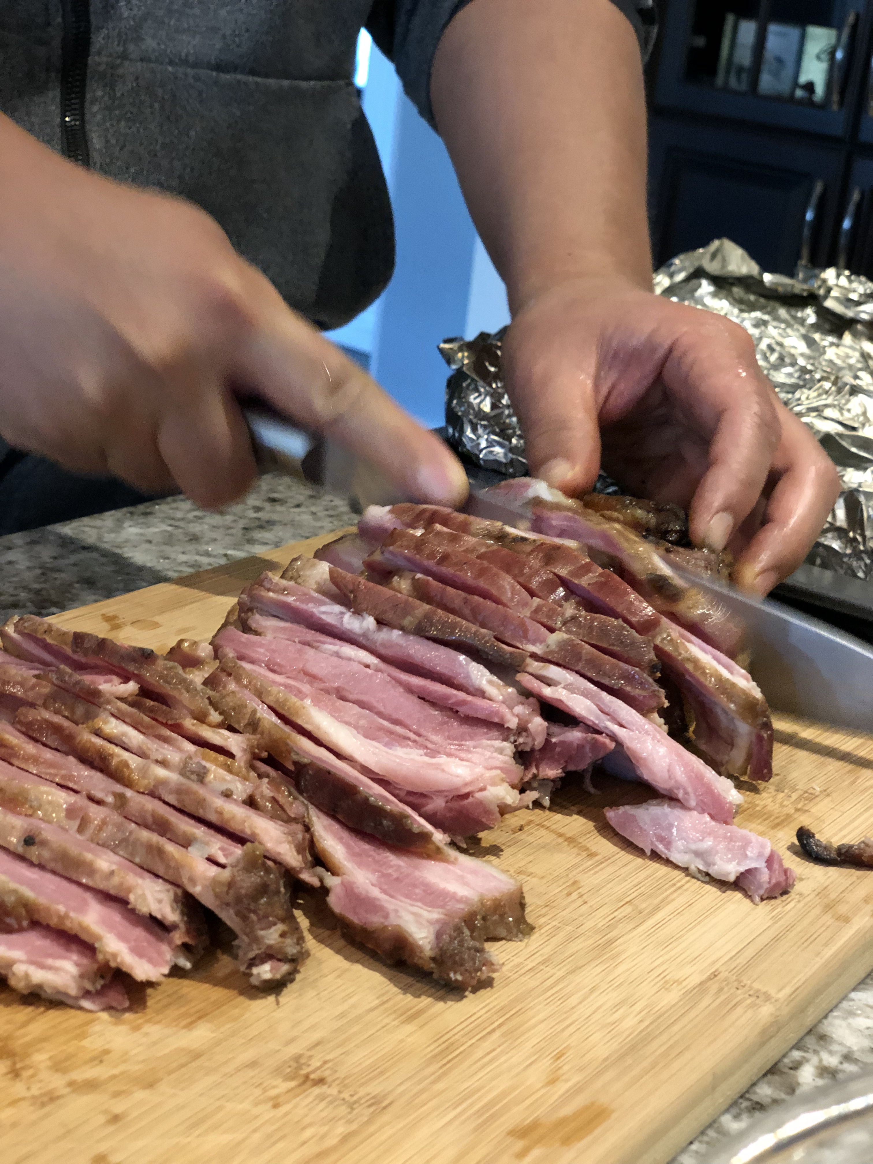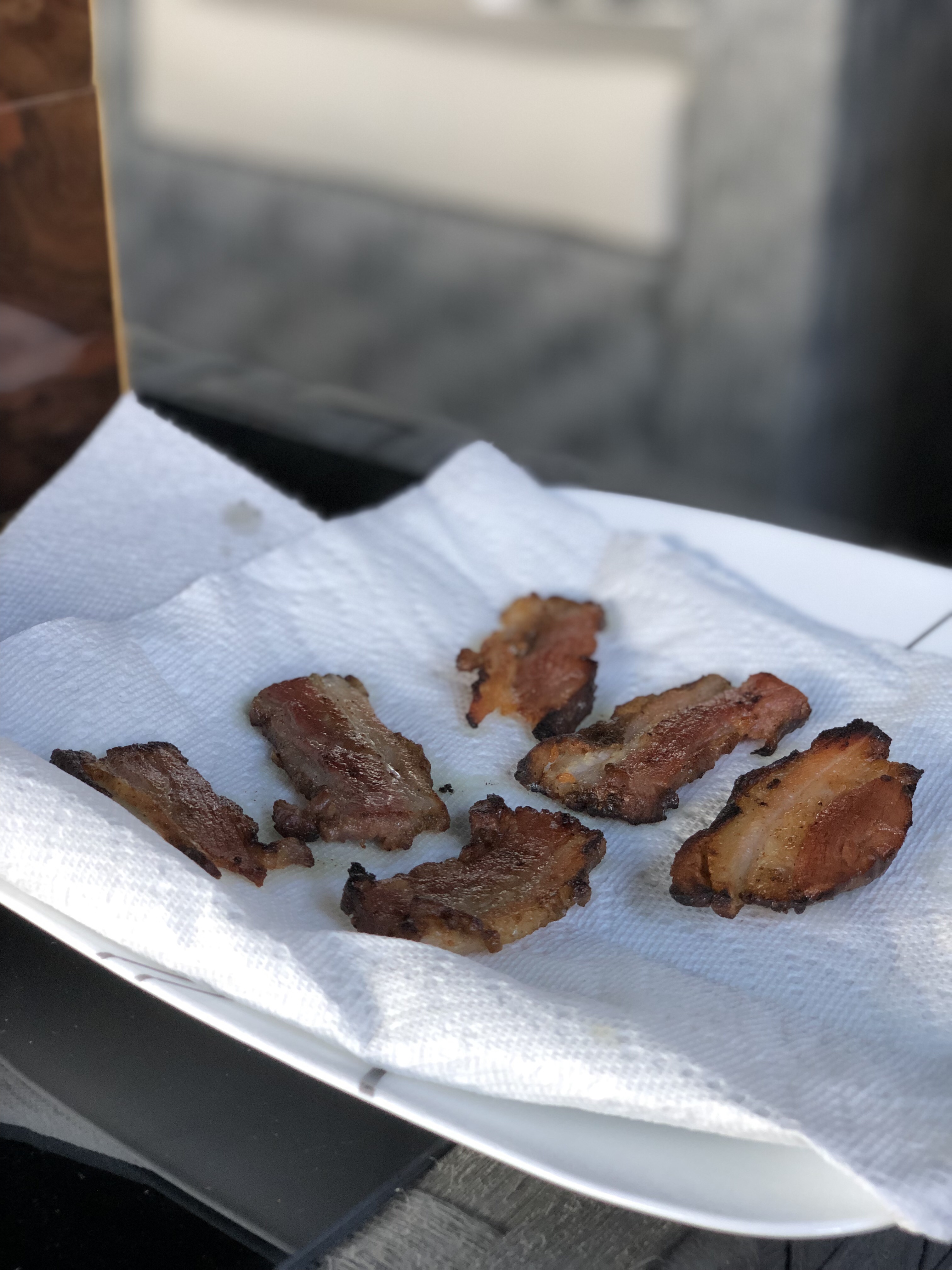 The product of love….. 2 lbs of organic pork belly, cured in the fridge for 5 days, smoked in the barbecue with apple wood chips for 4 hours, carefully sliced, pan fried and ready to eat.