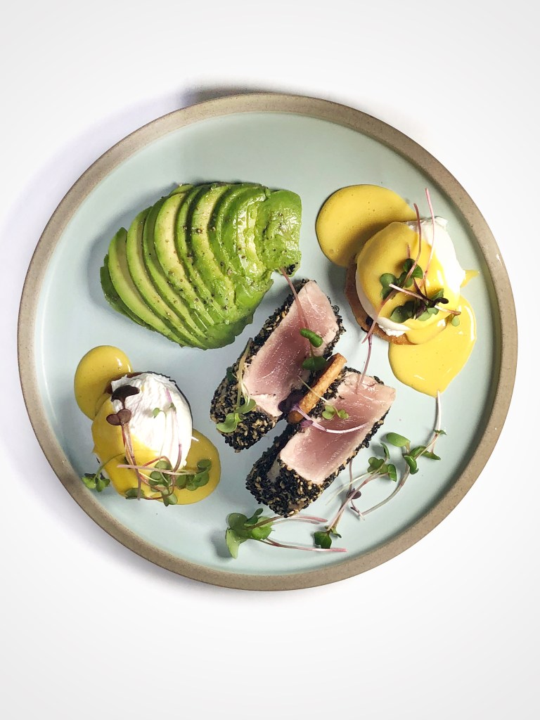 Brunch for dinner! Sesame crusted Ahi Tuna with perfectly poached eggs and a hollandaise sauce.